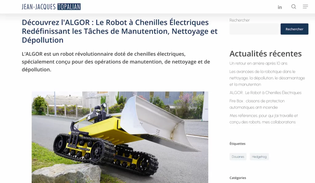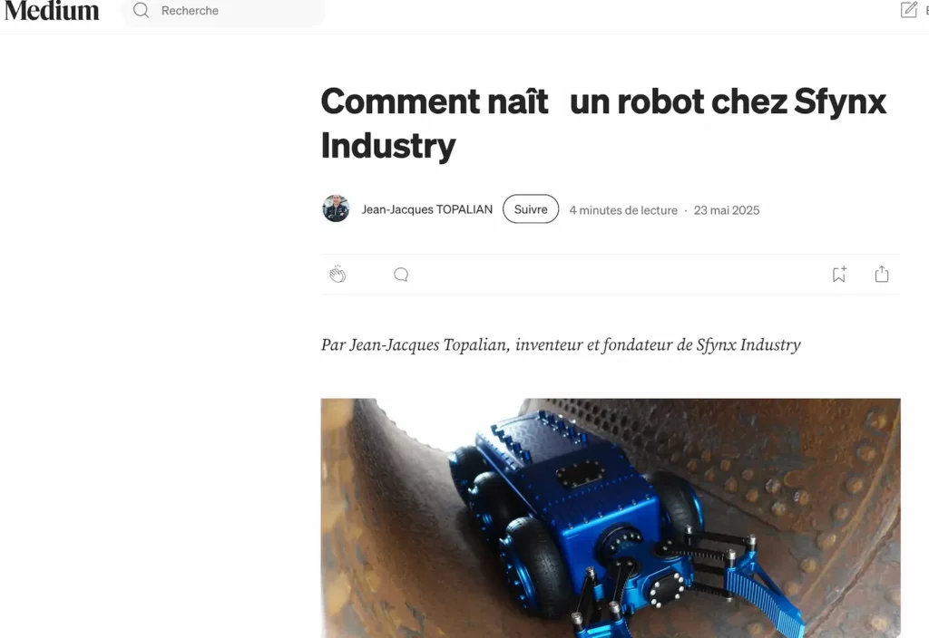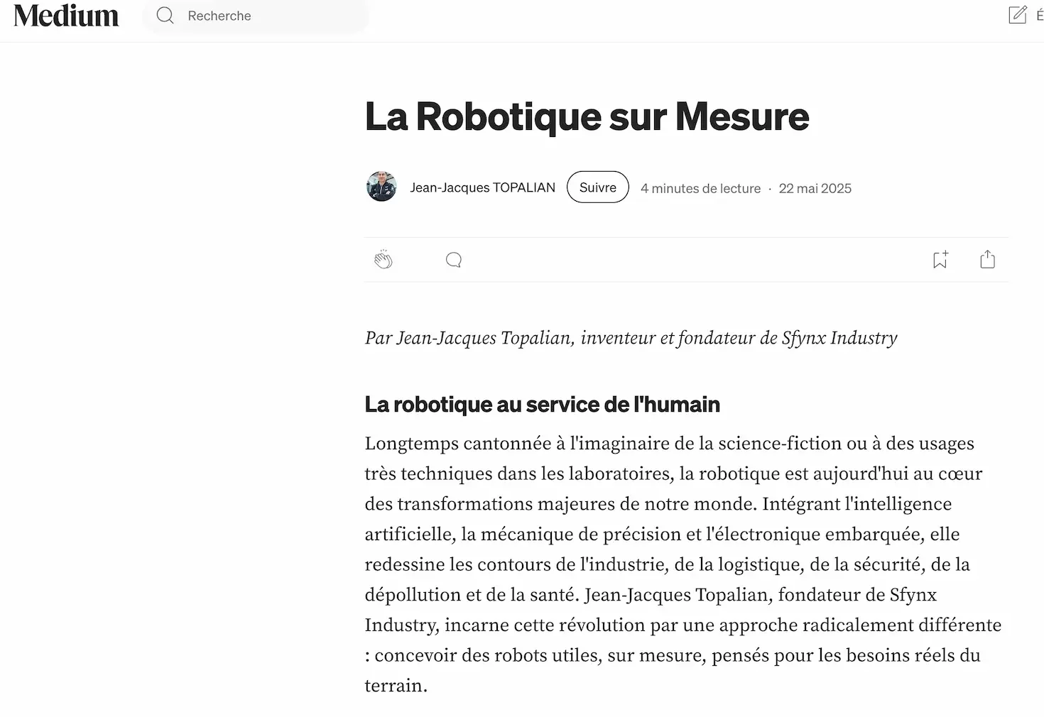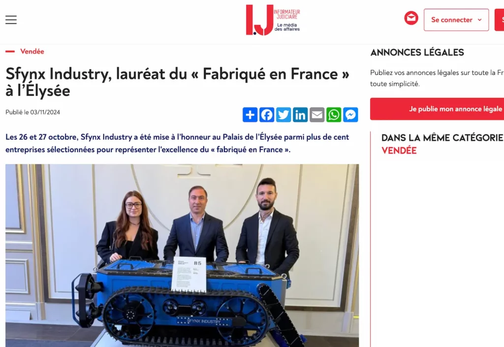 Actualités Notre Participation à l’Exposition "Fabriqué en France" Avec son robot, Sfynx Industry séduit jusqu’à l’Élysée L’évolution des batteries : des avancées révolutionnaires L’actualité signée Jean-jacques Topalian Lire l'article Presse La Robotique sur Mesure par Jean-Jacques Topalian Sfynx Industry, lauréat du « Fabriqué en France » à l’Élysée Comment naît un robot chez Sfynx Industry