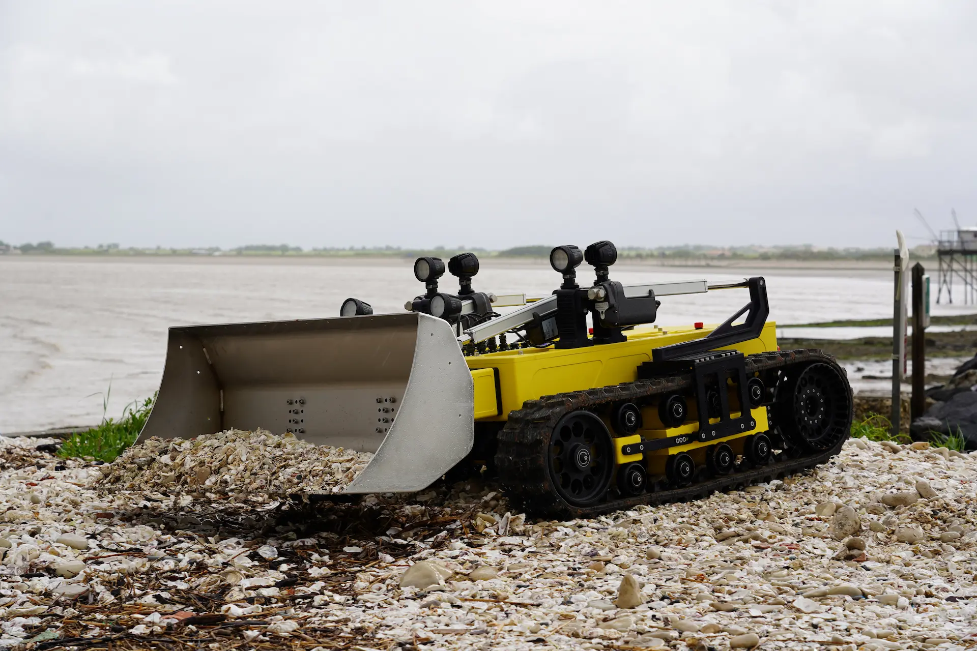 L’ALGOR est un véritable mini-bulldozer robotisé de 500 kg, équipé de chenilles et d’un châssis articulé breveté.