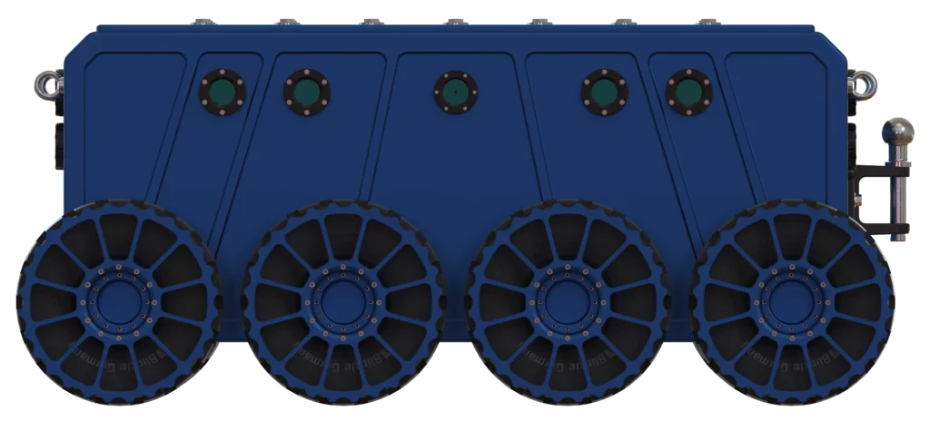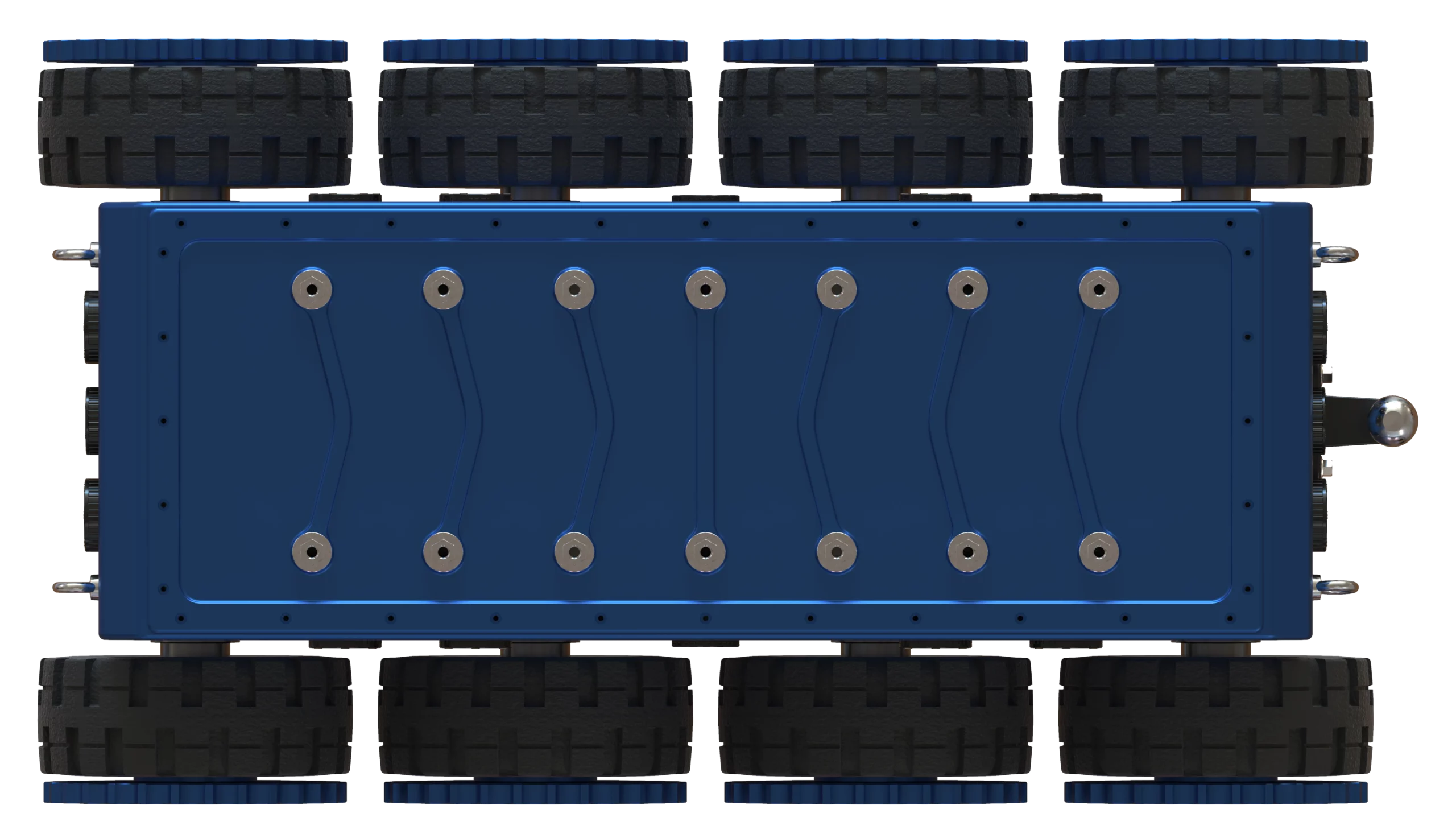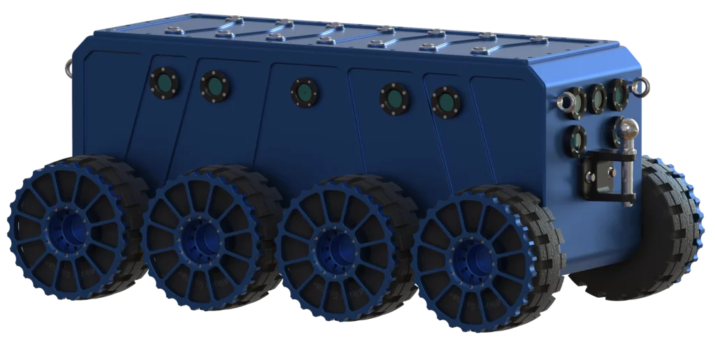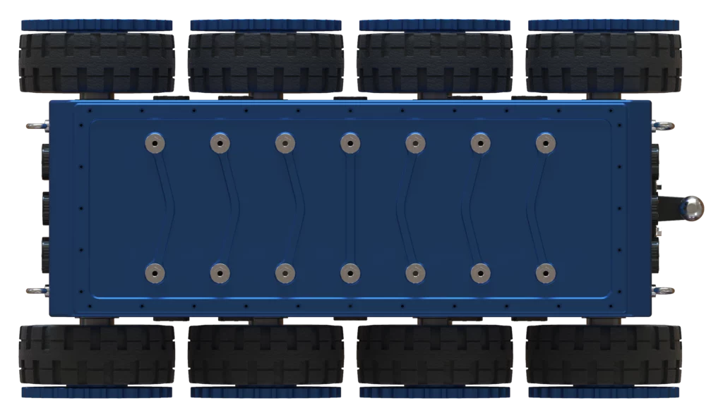 Châssis complètement étanche, conception robuste et économique, 8 roues motrices, et 3 batteries de 24V-50Ah intégrées.